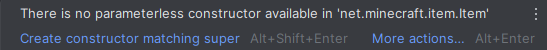 Tato chyba znamená, že třída Item má základní konstruktor (pro nastavení itemu), ale naše třída ho nemá. Stačí kliknout na Create constructor matching super a konstruktor se nám automaticky doplní. Případně si jej můžeme doplnit ručně.