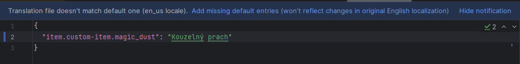 Český překlad se nachází v souboru cs_cz.json. přidané řádky buď můžeme ručně doplnit nebo by se nám měla nabízet automatická možnost doplnění v horní části obrazovky.