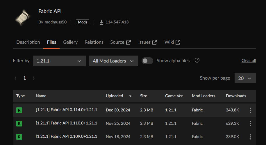 Jako první budeme potřebovat stáhnout mód Fabric API, ten totiž využívá většina módů a bez něj by nám nefungovaly. Odkaz na stažení najdete na stránce, kde jste si stahovali instalační soubor k Fabricu (text Fabric API). Mód je na stránkách curseforge.com. Na stránce s módem poté přejdeme na záložku Files a nastavíme Filter by na verzi Minecraftu, pro kterou jsme instalovali Fabric (v našem případě 1.21.1). Poté stáhneme nejnovější verzi ze seznamu (první soubor) a soubor uložíme do složky mods.