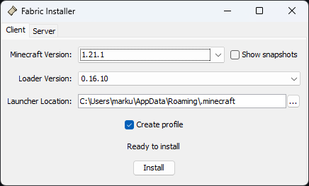 Ze stránek fabricmc.net/use/installer/ si stáhneme instalační soubor Fabricu (tlačítko Download for Windows). Po spuštění vybereme verzi Minecraftu, na kterou chceme Fabric nainstalovat (my máme mód pro verzi 1.21.1). Další nastavení můžeme nechat tak, jak jsou. Po kliknutí na Install se nám do Minecraft launcheru automaticky přidá nový profil s Fabricem.