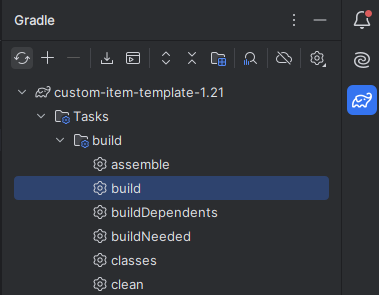 Soubor s módem vytvoříme pomocí Gradle tasks (úlohy). Tyto úlohy slouží například ke generování potřebných souborů pro projekt, stažení potřebných souborů a mimo jiné i k tvorbě výsledného balíčku s módem. Tyto úlohy v ItelliJ IDEA najdeme na pravé straně - ikona se slonem. Jednotlivé úlohy máme rozdělené do složek podle použití. Například ve složce fabric máme všechny úlohy, které se týkají fabricu - stažení potřebných souborů (downloadAssets), nastavení spuštění hry (configureLaunch) atd. Některé z těchto úloh se spouští třeba při vytvoření projektu nebo smazání vygenerovaných souborů.