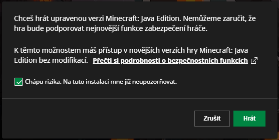 Můžeme zaškrtnout, aby se nám příště upozornění nezobrazovalo a kliknout na Hrát.