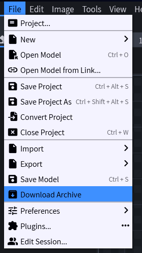 Jakmile máme texturu hotovou, tak si ji stáhneme. V menu nahoře zvolíme File > Download Archive. Stáhne se nám soubor assets.zip.