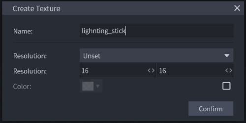 Po vytvoření projektu se nám zobrazí okno s nastavením projektu. Zde si nastavíme název textury - v našem případě název itemu lighnting_stick. Dále si můžeme změnit rozlišení, ale doporučuji použít základní 16x16, které se používá v Minecraftu pro všechny itemy.
