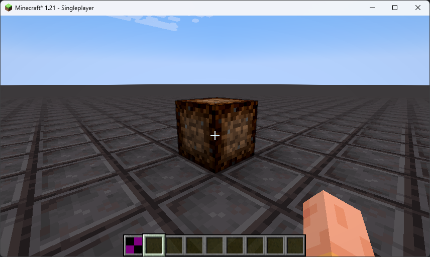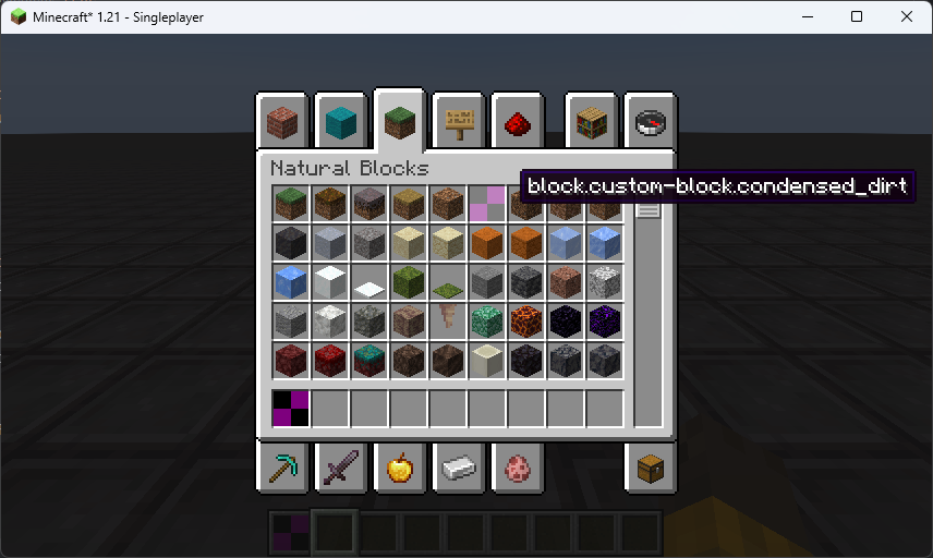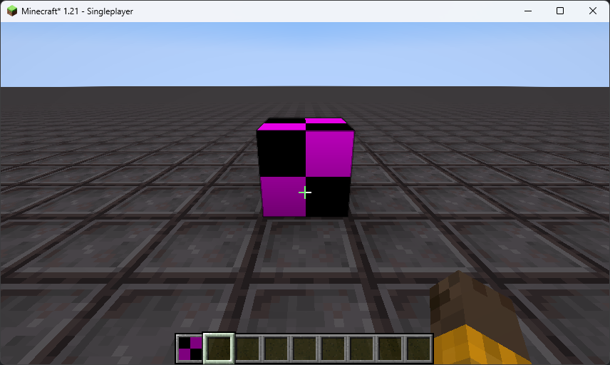 }Když nyní hru spustíme, tak bychom měli mít blok přidaný do hry. Můžeme jej ale získat jen pomocí příkazu /give @s custom-block:condensed_dirt. Blok také zatím nemá žádnou texturu a vypadá následovně: