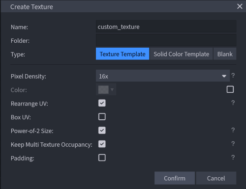 Vlevo vidíme část, kde se nám zobrazují textury. Pomocí tlačítka vpravo vytvoříme novou texturu (po přejetí myši se zobrazí nápis Create Texture). Jako název opět zvolíme custom_texture a zbytek můžeme nechat v základním nastavení.