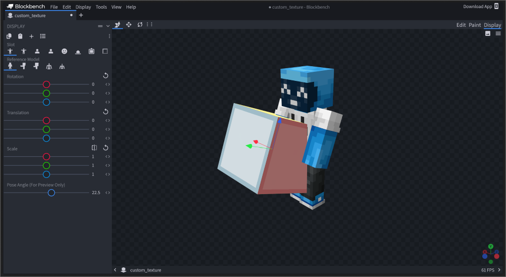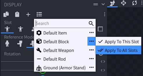 Abychom si dokázali představit, jak bude blok vypadat ve hře, tak zde máme záložku na zobrazení bloku/itemu v různých situacích. To najdeme v pravém horním rohu - Display. V základu vypadá blok následovně: