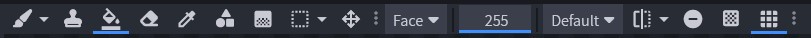 Poté zde máme kyblík, který používáme na vyplnění větší oblasti barvou. Zde si můžeme nastavit, co má kyblík vyplnit. V základu vyplňuje celou jednu stěnu objektu. Máme zde možnosti: