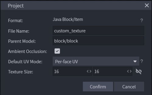 Dále se nám zobrazí okno pro vytvoření projektu, kde si zadáme hlavně název projektu/bloku. Zatím nebudeme tvořit žádný konkrétní blok, takže jej můžeme nazvat klidně jen custom_texture. Dále jako Parent Model zvolíme block/block. Tím zaručíme, že náš blok bude vypadat stejně jako všechny ostatní bloky v Minecraftu - například velikost bloku v inventáři, v ruce atd.