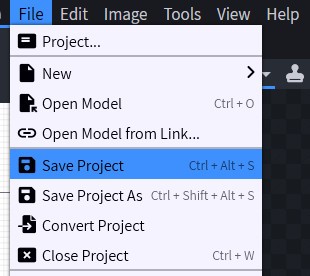 Projekt se ukládá v souboru typu bbmodel (blockbench model). Tento soubor poté může otevřít tak, že zvolíme File → Open Model.