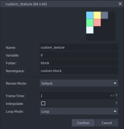 U textury je dále potřeba zvolit namespace projektu, aby se ve hře textura správně načetla. To uděláme tak, že na texturu klikneme pravým tlačítkem myši a zvolíme Properties. Otevře se nám okno, kde máme kromě dalšího nastavení textury právě i možnost nastavit namespace. Pro náš projekt si zvolíme namespace custom-block. Jinak bychom si zvolili namespace podle módu, do kterého blok tvoříme.