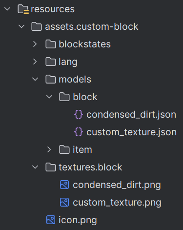 Textury (png soubory) budeme vkládat do složky src/main/resources/assets/custom-block/textures/block.