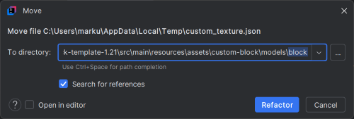 Pro vložení bloku tedy stačí otevřít stažený zip soubor z Blockbench, kde máme uložený model a texturu bloku. A poté přesunout soubory do příslušných složek. Mělo by se nám zobrazit okno s informací, jaký soubor kam kopírujeme. Tam stačí zvolit Refactor. Stejně vložíme i druhý soubor.