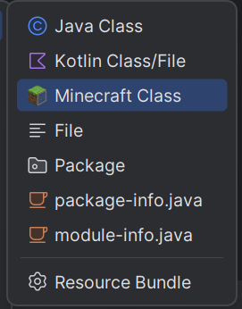 Na to si musíme nejprve pro blok vytvořit vlastní třídu. Třídu si vytvoříme ve složce src/main/java/com/example/block. Tvorbu si můžeme díky rozšíření Minecraft development zjednodušit a místo vytvoření nové Java třídy můžeme zvolit vytvoření Minecraft třídy.